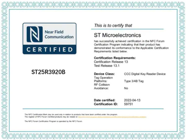 圖5:ST25R3920B獲得NFC Forum CR13認證 (圖源:ST官網)
