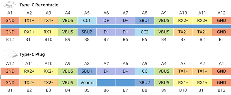 上圖中上半部分是Type-C母頭,下半部分是Type-C公頭,公頭比母頭少一組D+D-,這個(gè)設(shè)計(jì)是為了方便正反插。其中: