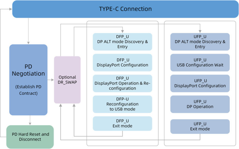 Type-C DP ALT模式協(xié)商流程都是通過(guò)USB PD協(xié)議的通信功能來(lái)完成,它是采用PD協(xié)議中VDM(Vender-Define message)的協(xié)議交互讓相連的設(shè)備進(jìn)入 DP等數(shù)據(jù)傳輸功能。