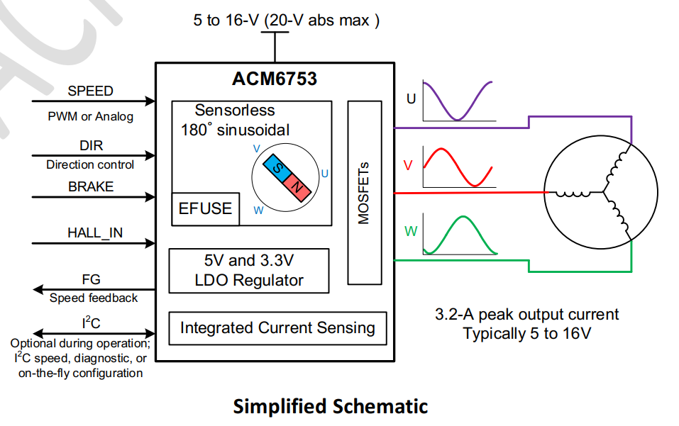 ACM6753是一款全集成三相無(wú)刷直流電機(jī)驅(qū)動(dòng)芯片。內(nèi)部集成三相無(wú)刷電機(jī)驅(qū)動(dòng)算法,功率管以及電流電壓檢測(cè)。能夠在極簡(jiǎn)外圍(只需要幾個(gè)阻容器件)的情況下驅(qū)動(dòng)三相無(wú)刷電機(jī)。