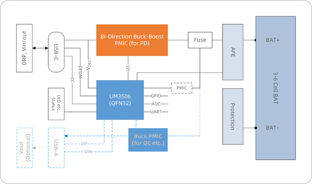 UM3506實現(xiàn)PD DRP協(xié)議,電源管理,并可與外置的電池包上的BMS進行通信,支持私有協(xié)議監(jiān)控電芯狀態(tài),確保充放安全