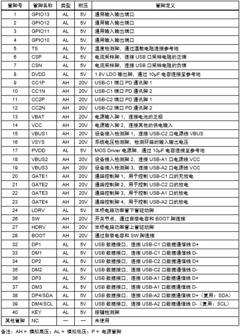 M12218 M12218是一款面向單電芯 22.5W 移動電源應用的專用SOC,集成了同步開關升壓變換器、電池充放電 管理模塊、顯示模塊、電量計算模塊,支持PD3.0、QC3.0、AFC、FCP、SCP、BC1.2 DCP等主流快充協議,并提供輸入/輸出的過壓/欠壓、電池過壓、過充/過放、NTC過溫、放電過流、輸出短路保護等完備的保護功能。配合極簡的外圍電路,即可組成支持LED顯示功能的22.5W多口移動電源。 QFN-40 3.3V-12V 單串22.5W移動電源快充SOC