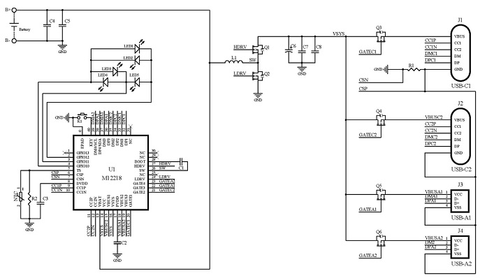 M12218 是一款面向單電芯22.5W移動電源應用的專用SOC,集成了同步開關升壓變換器、電池充放電管理模塊、顯示模塊、電量計算模塊,支持PD3.0、QC3.0、AFC、FCP、SCP、BC1.2 DCP等主流快充協議,并提供輸入/輸出的過壓/欠壓、電池過壓、過充/過放、NTC 過溫、放電過流、輸出短路保護等完備的保護功能。配合極簡的外圍電路,即可組成支持LED顯示功能的22.5W多口移動電源。