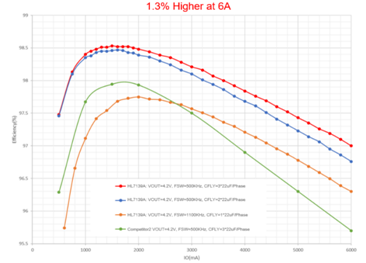 2)圖三,在相同CFLY數量的應用下,相對與友商2,HL7139A的效率提高1.3%,熱性能提高45%;在使用2pcs(1pcs/PH)CFLY應用下,HL7139A的效率提高1.0%;
