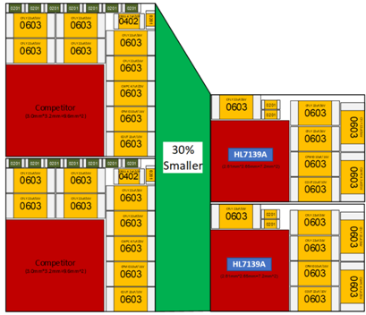 在66W并聯充電應用方案中,HL7139A的PCB整體尺寸在比友商同類產品小約30%,還可顯著實現更快速、更低功耗的電池充電功能。因為更小尺寸的整體解決方案,得以賦能產品更高的系統級設計靈活性。