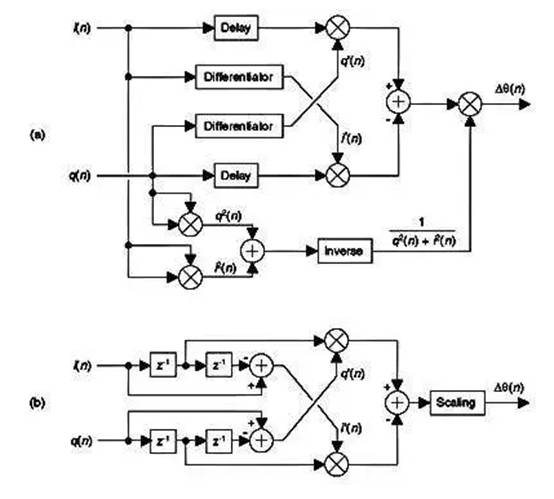 圖 13–61(a) 顯示了該算法的實現,其中i ( n ) 和q ( n ) 的導數分別為i’( n ) 和q ’( n )。Δφ( n ) 輸出序列用于等式。(13–111) 計算瞬時頻率。