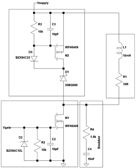 請注意,關斷時間隨V D3 (二極管 D3 的齊納鉗位電壓)線性下降。選擇 D3 的電壓,以便在 M1 或 M2 上不會發生雪崩事件。晶體管 M1 和 M2 的 V DS(max) 為 60V。R4 和 C4 構成一個緩沖電路,用于抑制電感負載以及 M1 和 D1 的寄生電容引起的諧振引起的振蕩。