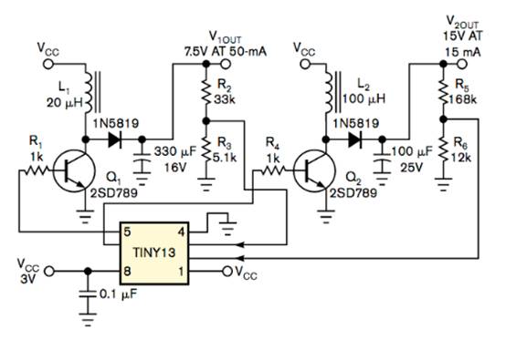 Tiny13 微控制器擁有兩個高速 PWM 通道和四個 10 位 ADC 通道。另一個 PWM 通道和一個 ADC 通道創(chuàng)建第二個 DC/DC 轉(zhuǎn)換器,輸出電壓為 15V,負載電流為 15mA。該轉(zhuǎn)換器的電感值為 100 μH。要計算輸出電容值,請使用公式 6。對于 5 mV 紋波,7.5 V 輸出電壓的電容器值為 270 μF,因為輸出電流為 50 mA,PWM 時間周期為 27 μsec,因此該電路使用接近的較大值 330 μF。同樣,對于 15V 輸出電壓,所需的電容器值為 81μF,因此設計使用 100μF 電容器。