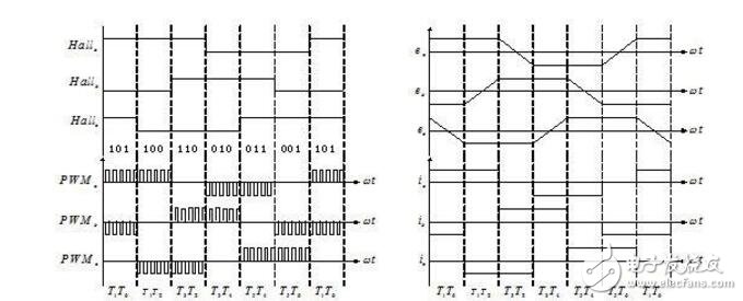 圖2: Hall狀態與PWM、三相反電動勢、三相電流的對應關系