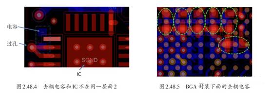 常見的 BGA封裝,其去耦電容通常放在 BGA下面,即背面。由于 BGA 封裝引腳密度大,因此去 耦電容一般放的不是很多,但應盡量多擺放一些,如圖2.48.5所示。