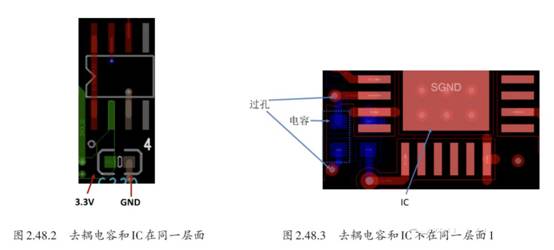 (4)保證去耦環路盡量小。去耦電容常見的擺放示例如圖2.48.2~圖2.48.4所示。圖2.48.2~圖2.48.4所示是SOP封裝的IC 去耦電容的擺放方式,QFP等封裝的與此類似。