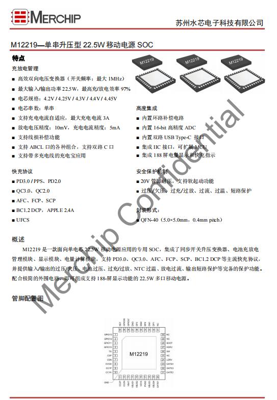 M12218和M12219是一款面向真22.5W移動電源應用的專用SOC,集成了同步開關升降壓變換器、電池充放電管理模塊、顯示模塊、電量計算模塊,支持UFCS(可選)、PD3.0、QC3.0、AFC、FCP、SCP、BC1.2、DCP等主流快充協議,并提供輸入/輸出的過壓/欠壓、電池過壓、過充/過放、NTC過溫、放電過流、輸出短路保護等完備的保護功能。