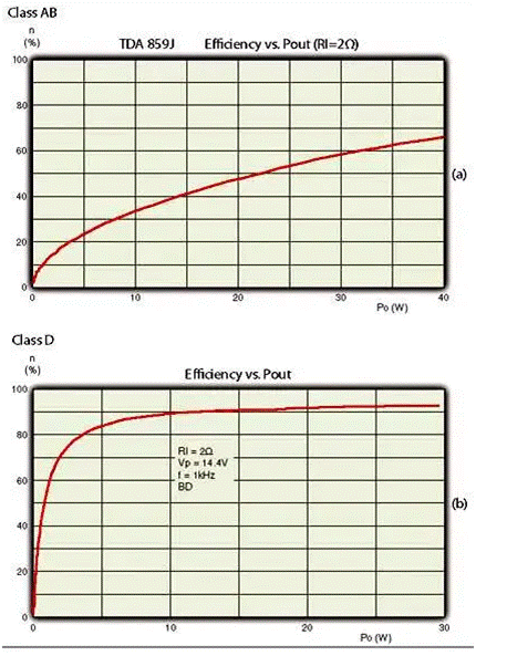 圖 1:D 類放大器在比 AB 類放大器更寬的范圍內(nèi)提供更高的效率。