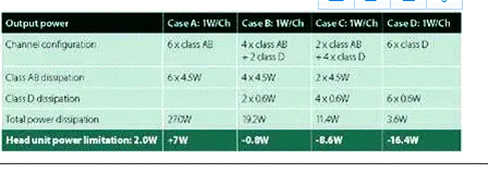 使用六個 AB 類放大器通道將導(dǎo)致總功耗為 27W——比通常認(rèn)為的音響主機(jī)的值多 7W,如表中的 A 所示。