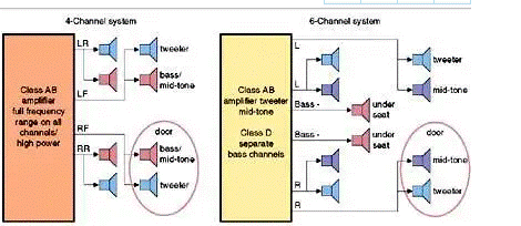 添加兩個通道可以解決幾個問題。首先,它允許大功率低音揚(yáng)聲器通過兩個新通道獨(dú)立驅(qū)動至汽車前排座椅下方的揚(yáng)聲器。消除門共振。更高的聲音保真度也是可能的,因?yàn)樗械膿P(yáng)聲器都沒有義務(wù)在整個頻率范圍內(nèi)工作。