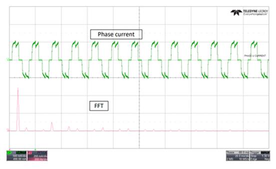 圖 3:相電流波形與快速傅里葉變換 (FFT) 非連續 PWM 之間的關系
