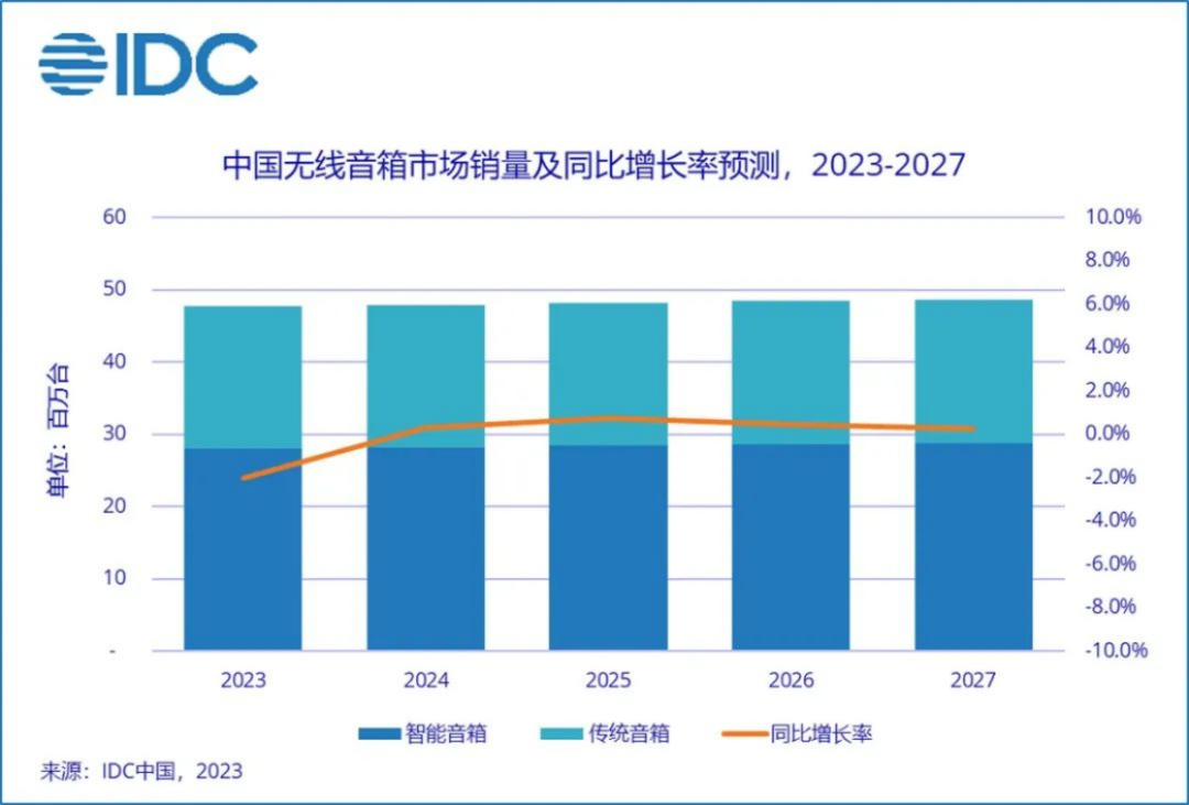 IDC預計,2023年中國無線音箱市場銷量將同比下降2%,降幅較去年有明顯收窄,然而消費環境及前期市場滲透率快速提升導致今年中國音箱市場銷售仍將面臨一定壓力。挑戰之下,經濟有序恢復、戶外需求回暖及人機交互優化也為市場發展帶來了機遇。