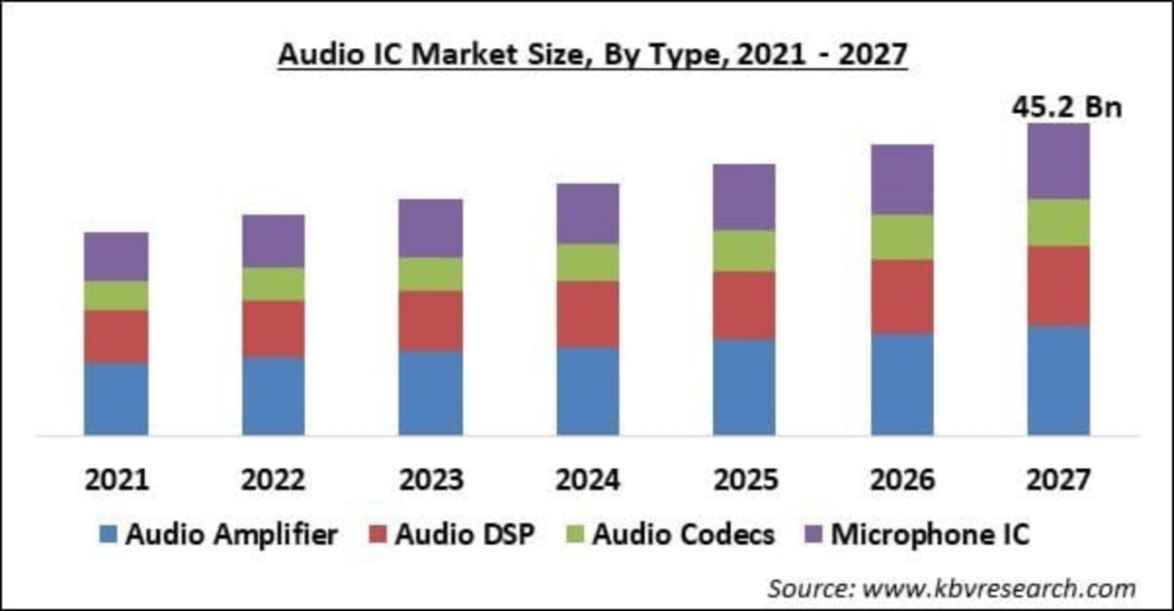 2021年,全球音頻芯片市場的收入規模為298.83億美元。隨著消費者對于音質要求的逐漸提高,個人便攜式電子產品、智能終端電子產品的更新換代,無線音箱的市場需求在逐步提升,受下游市場多元化需求的拉動,相應的音頻芯片需求也在逐步提升。根據Reportlinker預測,2022年至2027年,全球音頻驅動器IC市場將增長31.28億美元,在預測期內以15.86%的復合年增長率加速增長。