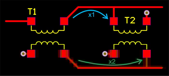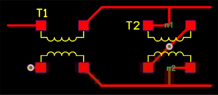 圖 5 顯示了該電路的另一種布局。在這種情況下,連接 T1 和 T2 的走線運(yùn)行到中點(diǎn)(上路徑為 n1,下路徑為 n2),然后連接到 T2 的相應(yīng)焊盤。這使得兩條路徑相同。此外,請(qǐng)注意對(duì)稱走線用于 T2 的兩個(gè)接地焊盤。