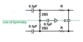 下圖顯示了改變對(duì)稱線如何讓我們保持運(yùn)行到運(yùn)算放大器反相輸入和運(yùn)算放大器輸出的走線的信號(hào)路徑對(duì)稱性。 |