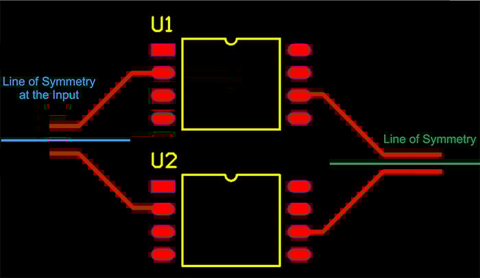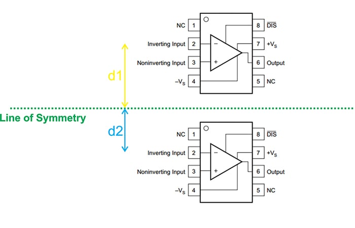 但是,非對(duì)稱包不是這種情況。例如,考慮一個(gè)采用 SOIC-8 封裝的運(yùn)算放大器。如圖 7 所示,相對(duì)于一條對(duì)稱線放置其中兩個(gè)封裝不會(huì)創(chuàng)建對(duì)稱布局。在此示例中,與下部運(yùn)算放大器的反相輸入相比,上部運(yùn)算放大器的反相輸入更遠(yuǎn)離對(duì)稱線。換句話說,d1 > d2。