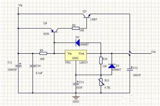 4、也可以使用LM317線性可調三端穩壓器實現。其輸出電流1.5A,若電流不夠時,可以使用三極管進行擴流,其原理如下圖所示。