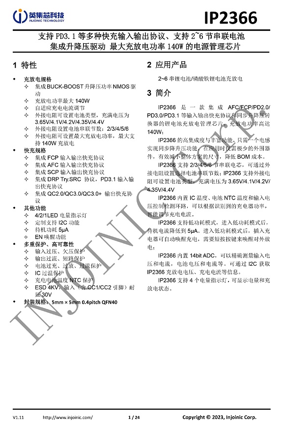 近日,作為國內電源管理芯片領域的知名廠商,英集芯響應市場潮流趨勢,針對鋰電池及磷酸鐵鋰電池應用,推出IP2366電源管理芯片,支持PD3.1快充協議,最大充放電功率達140W,支持輸入輸出雙向快充。