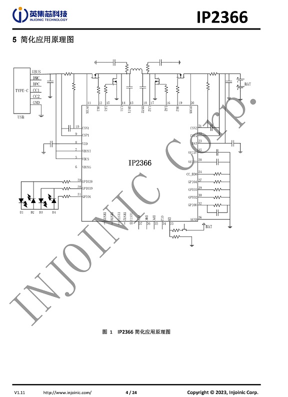 IP2366 支持 2/3/4/5/6 節串聯電芯,可通過外接電阻設置選擇電池串聯節數和電池類型;充滿電壓為 3.65V/4.1V/4.2V/4.35V/4.4V。內置 IC 溫度、電池 NTC 溫度和輸入電壓控制檢測環路,可以根據識別到的充電器功率,智能調節充電電流。