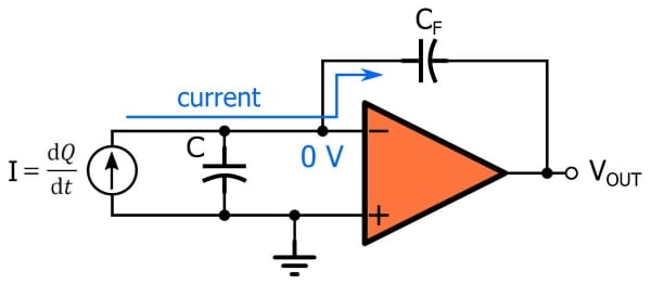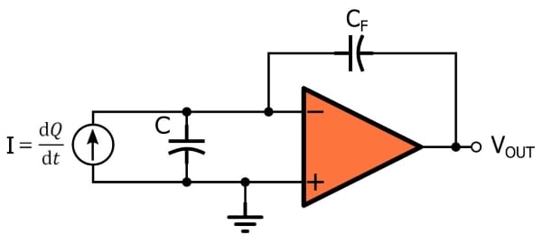 跨阻放大器接受輸入電流并將其乘以反饋路徑中的電阻,這不僅會(huì)增加幅度,還會(huì)將電流轉(zhuǎn)換為電壓。電荷放大器做類似的事情,但在反饋路徑中使用電容而不是電阻產(chǎn)生的輸出不與瞬時(shí)電流成比例,而是與電流隨時(shí)間的累積成比例。換句話說(shuō),輸出告訴我們一些關(guān)于電流積分(相對(duì)于時(shí)間)的信息,而不是給定時(shí)刻電流的大小。