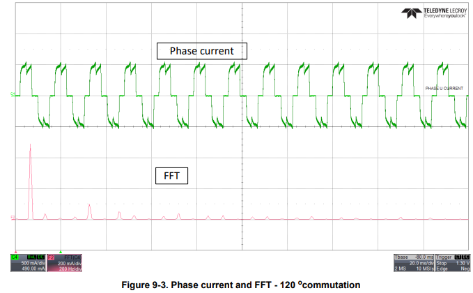 用于降低電機控制應用中可聞噪聲的最后一種策略是可變換向模式。在梯形換向中,有兩種主要配置:120 度和 150 度。120 度梯形換向可能會導致更多的聲學噪聲,因為較長的高阻抗周期會導致扭矩波紋增大,如圖 7 和 8 所示。150 度梯形換向只能在低速下運行,因為檢測過零的窗口期很短。