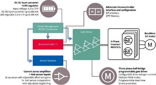 新型三相智能電機驅動器 IC 支持使用無刷直流 (BLDC) 或永磁同步 (PMS) 電機開發高性能電機驅動器。這些設計特別適用于移動機器人、無人機和電動工具應用。