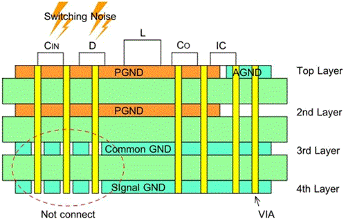 此外,如果在第三層上有公共接地,在第四層上有信號接地,則電源接地與第三和第四層接地之間的連接僅連接高頻開關(guān)噪聲較小的輸入電容器附近的電源接地。切勿連接噪聲多的輸出或續(xù)流二極管的電源接地。參見下面的截面示意圖。