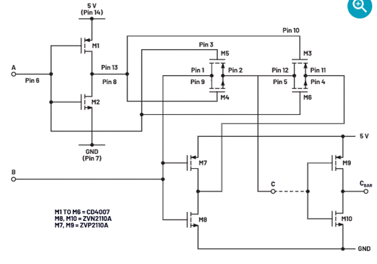 電路中有兩個邏輯輸入A和B。同相XOR輸出位于節點C,而該輸出的反相位于節點CBAR以形成XNOR函數。