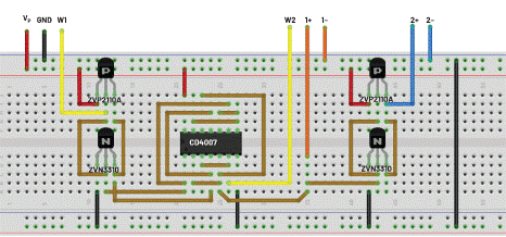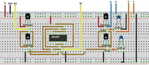 使用四個獨立NMOS和PMOS晶體管(ZVN2110A和ZVP2110A)構建的反相器對也可以由第二個CD4007 IC構成,或者可以是采用六路反相器IC的CMOS反相器,如74HC04或CD4049。CD4066四通道SPST開關也可以作為采用CD4007構建的開關的替代器件。