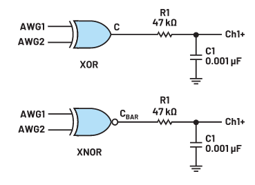 將圖6所示的RC低通濾波器添加到XOR試驗板電路中。將示波器通道1連接到RC濾波器輸出。