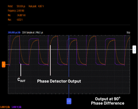當XOR門鑒相器用于PLL系統時,它通常鎖定在相位檢測范圍中間的90°相位差附近。在90°時,XOR具有50%占空比的方波輸出,輸出頻率是輸入頻率的兩倍。方波占空比根據兩個輸入信號的相位差發生變化。XOR門的輸出通過低通濾波器產生的模擬電壓與兩個信號之間的相位差成正比。它需要對稱的方波輸入。如果一個輸入的占空比與另一個輸入的占空比略有不同,則低通濾波輸出將會偏移90°相位差時的理想中間范圍。