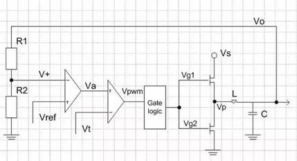 如上圖,為了從高電壓Vs得到Vo,開關電源采用了用一定占空比的方波Vg1,Vg2推動上下MOS管,Vg1和Vg2是反相的,Vg1為高,Vg2為低;上MOS管打開時,下MOS管關閉;下MOS管打開時,上MOS管關閉。由此在L左端形成了一定占空比的方波電壓,電感L和電容C我們可以看作是低通濾波器,因此方波電壓經過濾波后就得到了濾波后的穩定電壓Vo。Vo經過R1、R2分壓后送入個放大器(誤差放大器)的負端V+,誤差放大器的輸出Va做為第二個放大器(PWM放大器)的正端,PWM放大器的輸出Vpwm是一個有一定占空比的方波,經過門邏輯電路處理得到兩個反相的方波Vg1、Vg2來控制MOSFET的開關。