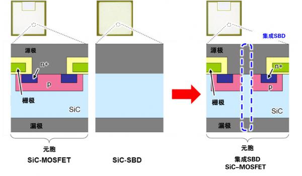 圖2:集成SBD的SiC-MOSFET實(shí)現(xiàn)了SiC-MOSFET和SiC-SBD一體化