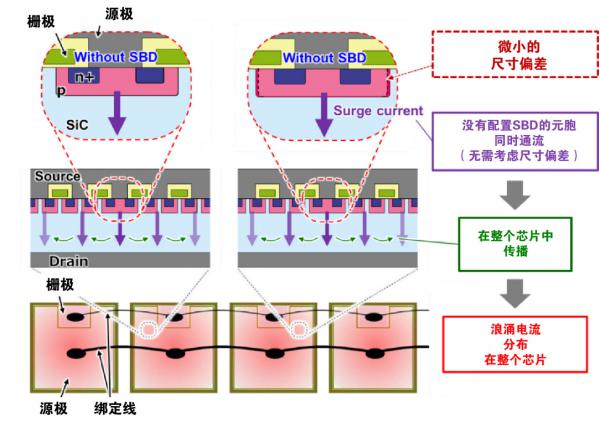 此外,由于浪涌電流降低了SiC周邊的阻抗,觸發(fā)其周圍元胞開始導(dǎo)通,形成連鎖反應(yīng)。這種現(xiàn)象導(dǎo)致以沒有配置SBD的元胞為起點(diǎn),浪涌電流在整個(gè)芯片區(qū)域傳播。因此,浪涌電流分布在所有芯片的所有區(qū)域,防止了由于浪涌電流集中在特定芯片上而導(dǎo)致的芯片熱擊穿,從而提高了浪涌電流耐量(圖4)。