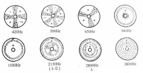 這個過程跟揚(yáng)聲器發(fā)聲過程有相似之處。在音圈通電后,變成電磁體,與永磁體產(chǎn)生作用力,連續(xù)驅(qū)動振膜發(fā)聲。但這個過程不能視為簡單的活塞運(yùn)動,振膜不是完全的剛體,其運(yùn)動時,本身會像水面一樣會產(chǎn)生形變。波形沿著由音圈與振膜粘合處向四周和前端傳播,到遇到折環(huán)時,波也會像漣漪一樣被反射回來,從而與其他波形相互干涉。實際情況比水滴濺出漣漪要更加復(fù)雜,因為驅(qū)動頻率高得多,變化也快得多。頻率達(dá)到某個值時,振膜因為波的相互干涉而形成區(qū)域化的振動。