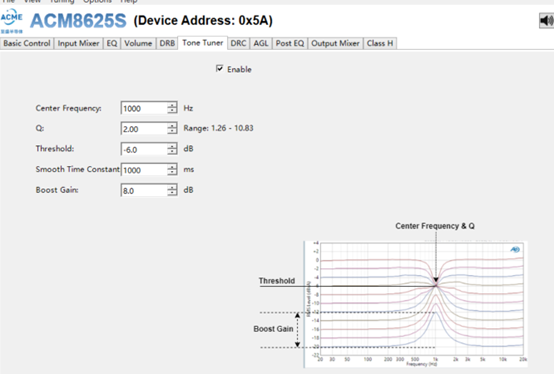 除了材料的改變,至盛音頻功放DSP中的模塊提供了Tone Tuner可以針對分割震動做電信號的優(yōu)化。在8625P/8625S產(chǎn)品中增加了Tone Tuner模塊。下面對這個模塊的幾個參數(shù)做下解釋。