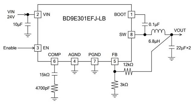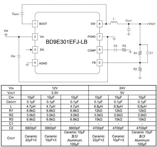 出處:7.0V~36V 輸入、2.5A 內(nèi)置MOSFET 1ch 同步整流降壓DC-DC轉(zhuǎn)換器 – BD9E301EFJ-LB(E2) | ROHM Co., Ltd.