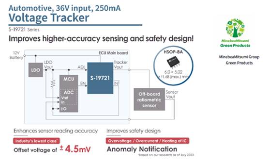 美蓓亞三美株式會社(MinebeaMitsumi Inc.) 旗下的艾普凌科有限公司(ABLIC Inc.,總裁:田中誠司,總部地址:東京都港區,下稱“ABLIC”)今天推出了車載用電壓跟蹤器S-19721系列。