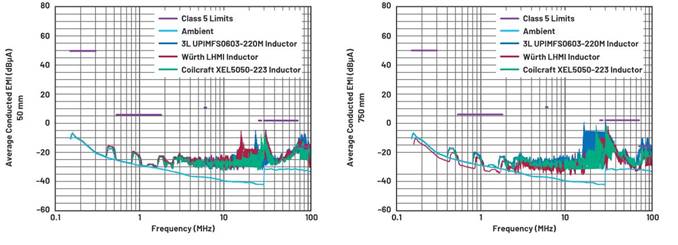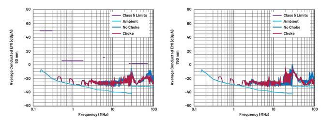 圖4顯示了50 mm和750 mm平均電流探頭CE結果,對不安裝扼流圈的初始電路和將扼流圈安裝在LED驅動器電路之前的電路進行比較。圖中也顯示了環境本底噪聲作為參考。FM頻段CE(76 MHz至~108 MHz)降低了8 dBµA以上。