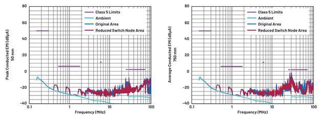 高dV⁄dt開關節點是一個噪聲源,會產生電容耦合,增加CE中的CM EMI噪聲。它也像天線一樣工作,向空間輻射電磁噪聲,也會影響輻射EMI。因此,盡可能減小PCB布局上的開關節點面積可以改善EMI性能。為了在PCB電路板上測試這一點,我們切除了部分銅芯,并將電感移動到更靠近IC的位置(如圖7所示),以此減小開關節點面積。我們測試了切除銅芯之前和之后的EMI,測試結果如圖8所示。