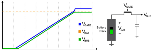 MP279x 系列產(chǎn)品采用高邊架構(gòu),在提供強大保護功能的同時也能最大限度地減少 BOM。此外,高精度電荷泵控制還支持 N 溝道 MOSFET軟導通功能,它無需任何額外的預充電電路,這進一步將 BOM 尺寸與成本降至很低。軟導通通過緩慢增加保護 FET的柵極電壓來實現(xiàn),它允許小電流流過保護器件以對負載進行預充電(見圖 3)。通過配置幾個參數(shù)可確保安全的過渡,例如最大允許電流,或直到保護 FET關(guān)斷而無觸發(fā)故障的時間。