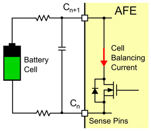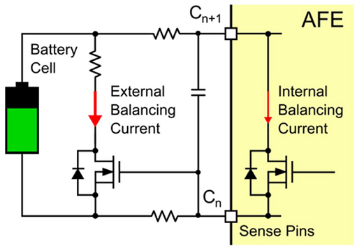 被動均衡是均衡電池電壓最常用的方法,它需要對電量較多的電池進行放電,直到所有單電池都擁有均等的電荷。MP279x 系列AFE中的被動電池均衡功能可以在外部或者內(nèi)部完成。外部均衡允許較大的均衡電流,但也會增加 BOM(見圖 4)。