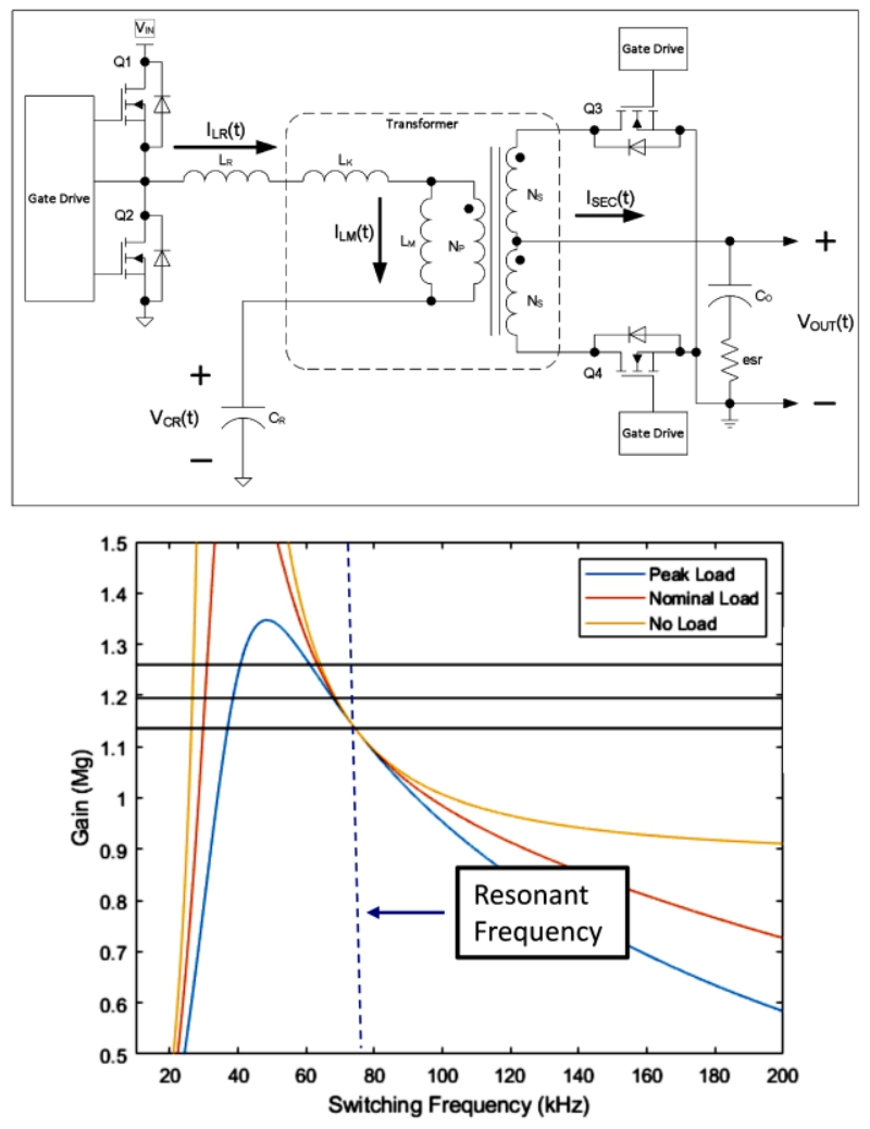 這種配置有幾個優(yōu)點。首先,它通過利用線圈和電容器之間的諧振來提供高效率,從而降低開關(guān)損耗。此外,變壓器提供的電氣隔離允許轉(zhuǎn)換器的輸入和輸出分離,從而保護控制電路并允許調(diào)整變壓器變比。從增益響應(yīng)曲線圖中可以看出,根據(jù)開關(guān)頻率的不同,存在三種不同的情況。