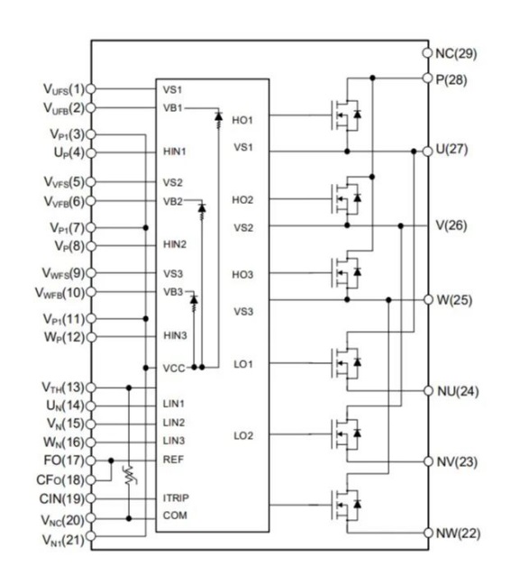 IPM29- SiC_MOS新系列產驅動集成了自舉電路、一體化使能與可調故障輸出(FO)、防直通互鎖、欠壓保護與溫度輸出功能,優化的高壓柵極驅動配合內集成的高速、低阻抗SiC_MOSFETS逆變橋,極大地改善產品工作EMI特性與開關損耗,適用于高頻開關需求的電機驅動應用。
