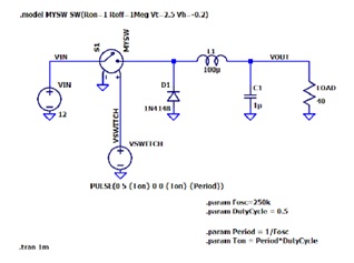 物理轉換器電路中的功率開關通常是場效應晶體管。在此模擬電路中,我使用電壓控制開關,其規格由 .model MYSW SW(...) 語句確定。開關特性非常有利,但不太理想: